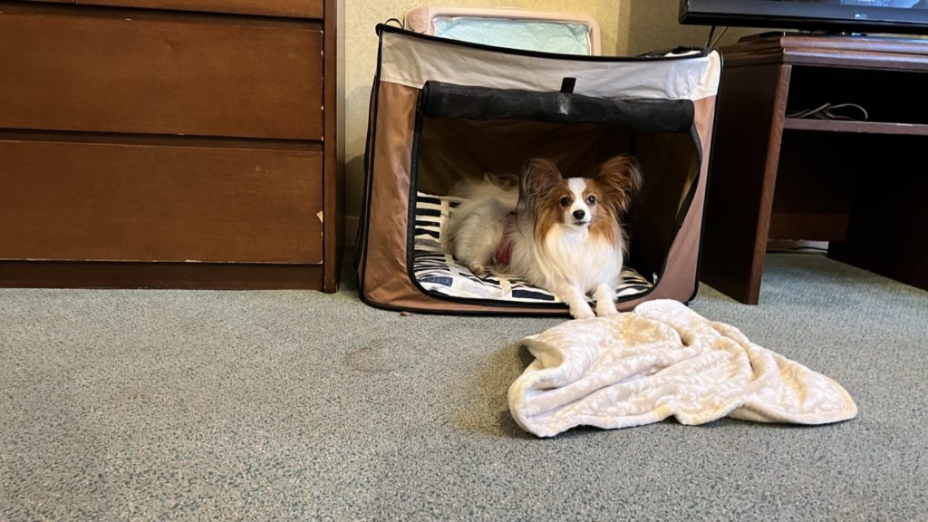愛犬たちを人間用のベッドに上げるのは禁止なので、愛犬には普段使ってる犬用のベッドやマットを持参します。